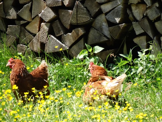 Auf unserem Hof leben auch Hühner. Sie haben täglich Zugang zur Weide. Ihre Eier sind schön dunkelbraun mit einem gesunden, gelben (nicht orangem!) Dotter. (Leider hat die Lebensmittelindustrie über jahrelanges Füttern von Farbstoffen dafür gesorgt, dass man heute glaubt, Eigelb müsse leuchtend orange sein. Natürliches Eigelb ist aber eigentlich zartgelb.)